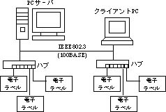 システムの構成図を図4に示す.システムはPCサーバ,クライアントPC,ハブ(ネットワークの中継装置),電子ラベルなどから構成する.また,それらを汎用ネットワークであるIEEE802.3(100BASE)で接続する.なお,システム規模に応じてハブの台数やクライアントPCの台数を増やせることはもちろんのこと,小規模施設等ではクライアントPCを省くことが可能である.また,ネットワークシステムに接続が可能な電子ラベルの最大数は254個である.PCサーバおよびクライアントPCにはWindows NTを採用している.今回新たに開発したソフトウェアは,情報案内登録ソフトウェア,通信制御用ソフトウェア,配信起動ソフトウェアなどである.図4 システムブロック図